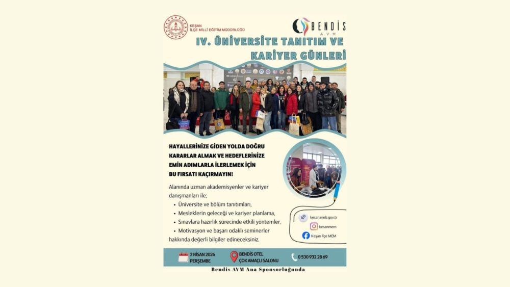 Keşan İlçe Milli Eğitim Müdürlüğü ve Bendis AVM işbirliğiyle düzenlenen ‘IV. Üniversite Tanıtım ve Kariyer Günleri’, yarın kapılarını açıyor. Uzman akademisyenlerin katılacağı etkinlikte öğrenciler, hayallerindeki üniversite ve bölümler hakkında detaylı bilgi alma fırsatı bulacak.