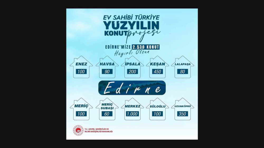 AK Parti Edirne Milletvekili Dr. Fatma Aksal, Cumhurbaşkanı Recep Tayyip Erdoğan tarafından açıklanan ‘Ev sahibi Türkiye: Yüzyılın Konut Projesi’ kapsamında, Edirne’ye 2 bin 530 konut yapılacağını açıklarken, AK Parti Keşan İlçe Başkanı Savaş Pekdemir de bu konutlardan 450 tanesinin Keşan’a yapılacağı bilgisini verdi.
