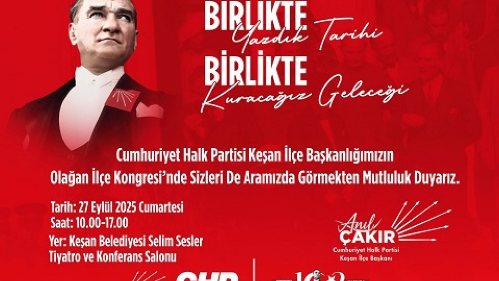 342 delegenin oy kullanacağı Kongre, 10.00 – 17.00 saatleri arasında Keşan Belediyesi Selim Sesler Tiyatro ve Konferans Salonu’nda yapılacak. CHP Keşan İlçe Başkanı Anıl Çakır, tüm üyeleri ve yurttaşları kongreye davet ederek, “Birlikte yazdık tarihi, birlikte kuracağız geleceği” sloganıyla partinin köklü geçmişinden aldığı güçle geleceğe kararlılıkla yürüyeceklerini vurguladı.