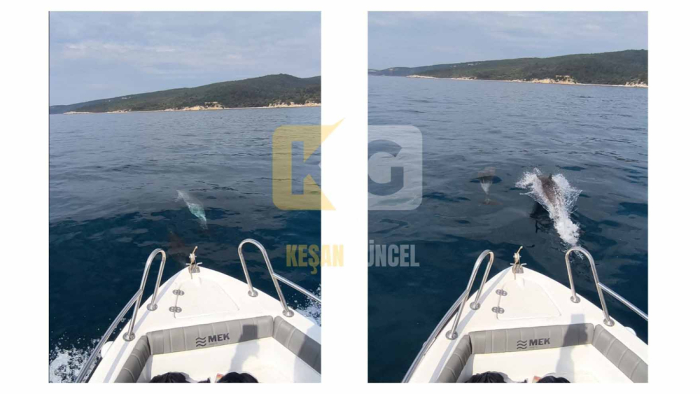 Saros Körfezi’ne kıyısı bulunan Keşan’a bağlı Gökçetepe sahilinde tekneyle yarışan yunuslar cep telefonuyla görüntülendi.