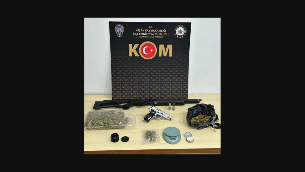 Keşan İlçe Emniyet Müdürlüğü Kaçakçılık ve Organize Suçlarla Mücadele Büro Amirliği ekipleri, uyuşturucu ticareti yaptığı belirlenen İ.Ç.'nin evinde arama yaptı. Aramada, 1 ruhsatsız tabanca, 1 havalı tüfek, 2 tüfek fişeği, 470 gram esrar, 10 uyuşturucu hap, esrar öğütücü ile hassas terazi ele geçirildi. Polis, İ.Ç.’yi gözaltına aldı. Emniyetteki işlemlerinin ardından adliyeye sevk edilen İ.Ç., çıkarıldığı hakimlikçe tutuklandı.